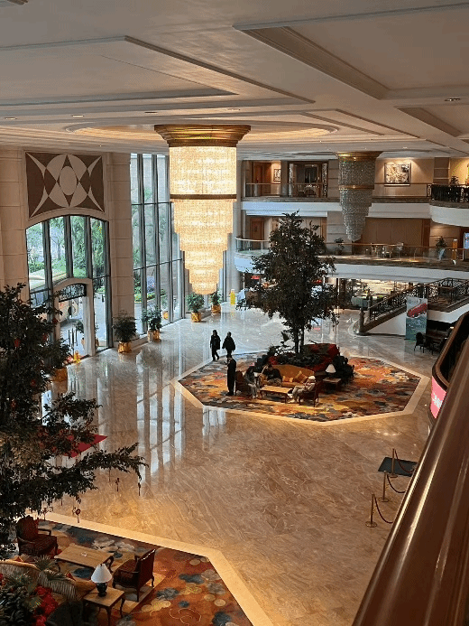 之后我们一行人来到了帝豪酒店,是目前汕头最大的酒店建筑,床位数1200张,分为帝豪酒店、精品酒店、酒店公寓三种类型,满足不同人群需求。帝豪酒店楼高33层,有556间套房。酒店中有停车场、保龄球场、棋牌室、中西餐厅、会展中心、会议室和多功能宴会厅等设施。设计以其独特的造型、先进的设计理念以及高效的能源管理系统,向我们展示了现代建筑技术与美学的完美结合。实地考察中,我们深入了解了酒店建筑设计背后的思考,对如何在商业建筑中平衡美观与实用有了更深的认识。