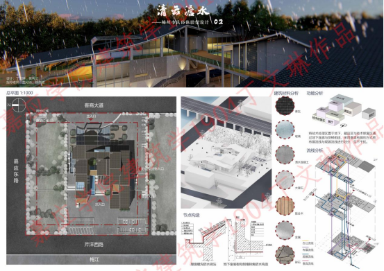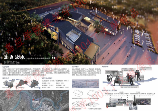 获奖作品《清云澹水——梅州市民俗体验馆设计》选址位于梅江区秀兰大桥附近,北靠嘉应东路,南接梅州海事局,东临客商大道,西隔芹洋西路与梅江相望,交通便利,坐拥梅江优良景观。建筑造型上转译客家民居传统双坡屋面为长短坡结合的曲面屋面,尊重传统的同时表达出现代性特征;空间组织上,巧妙运用不同空间层高需求解决场地高差,采用开放合院,面向梅江,形成空间渗透,创造富有“新客家”特色的民俗体验馆。