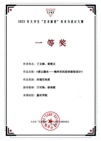 近日,“2023年大学生美术与设计大赛”圆满落下帷幕。我院建筑学1904班丁文琳,2004班黄隽文作品《清云澹水——梅州市民俗体验馆设计》在徐伟陵副教授、兰可染老师的指导下获得环境空间组一等奖。