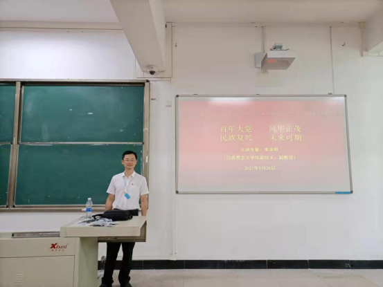 围绕习近平总书记在庆祝中国共产党成立100周年大会上的重要讲话精神,马克思主义学院副院长李学明以“百年大党,风华正茂,民族复兴,未来可期”为题,主要阐述了四个方面内容:一是回顾了中国共产党的百年光辉历程;二是诠释了什么是伟大的建党精神;三是展望了中华民族伟大复兴的“九个必须”;四是号召全体中国共产党党员为民族复兴、国家富强、人民幸福而努力奋斗。