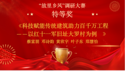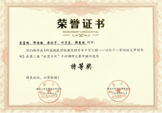 近日,yl6776永利集团学生蔡富朋团队主持的《罗古喧天:科技赋能传统建筑助力百千万工程——以红十一军旧址大罗村为例》调研项目,在暨南大学经济与社会研究院、乡村振兴研究院、社会调查中心与共青团暨南大学委员会联合主办的第二届“故里乡风”——千村调研大赛中获得特等奖(如图1)。