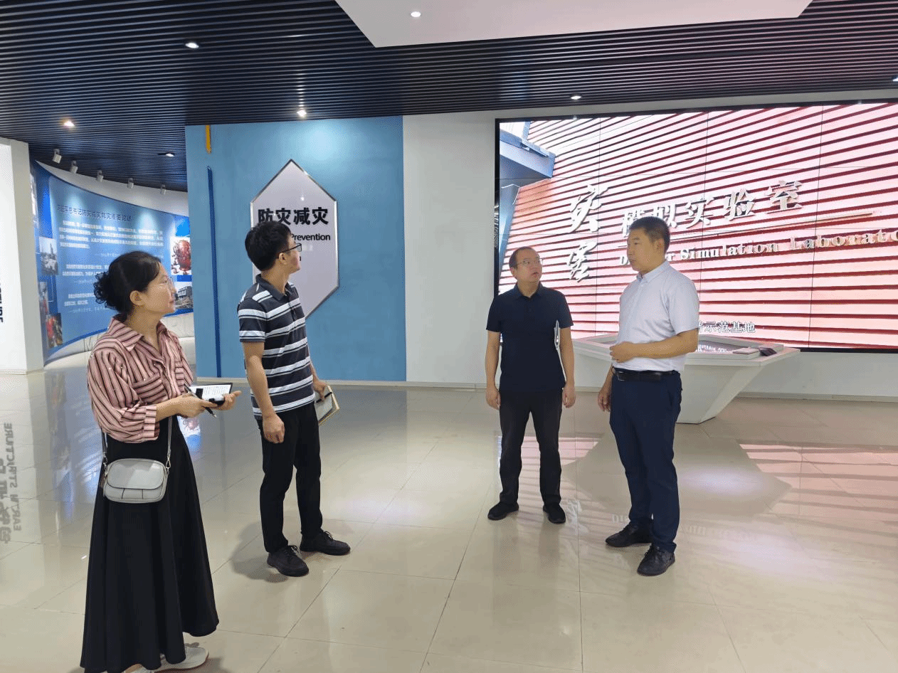 座谈结束后,孙治国院长亲自带队参观了防灾科技学院的灾害模拟实验室,详细介绍了实验室的建设历程、所获国家级及行业内荣誉,并逐一讲解了各实验设备的功能与应用场景。现场通过动态演示,直观呈现了建筑隔震技术的实际效果,以及滑坡、泥石流、砂土液化等自然灾害的形成机理与演化过程,让调研团成员对灾害防控相关实验技术有了更清晰的认知。随后,还实地考察了工程结构实验室、力学实验室等教学科研平台,深入了解其建设与运行模式。