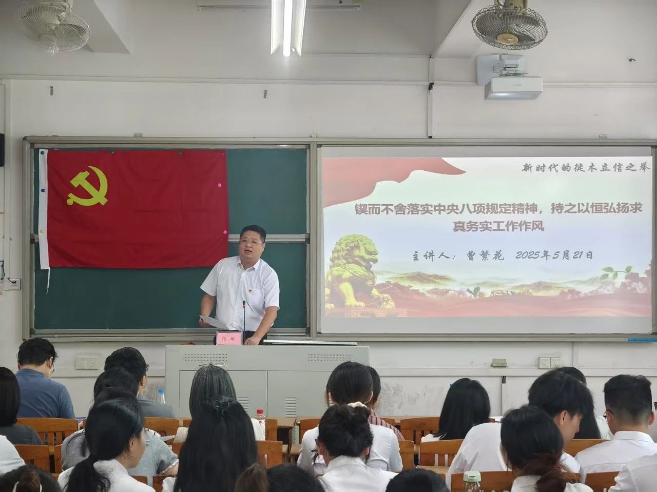 为进一步推进深入贯彻中央八项规定精神学习教育,加强全院师生党员的纪律意识,强化作风建设,我院于5月21日下午在公颜实训大楼C508室组织开展了学习教育活动。马克思主义学院副教授曾繁花以“锲而不舍落实中央八项规定精神,持之以恒弘扬求真务实工作作风”为主题讲授专题党课,共计60余人参加了此次党课学习。