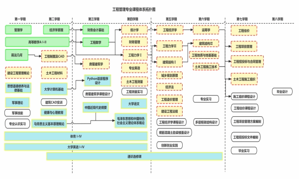 核心课程:管理学原理、工程经济学、建筑结构、房屋建筑学、工程项目管理、土木工程施工技术、工程力学、财务会计基础、工程制图及CAD、土木工程测量、工程估价、工程招投标与合同管理等。
